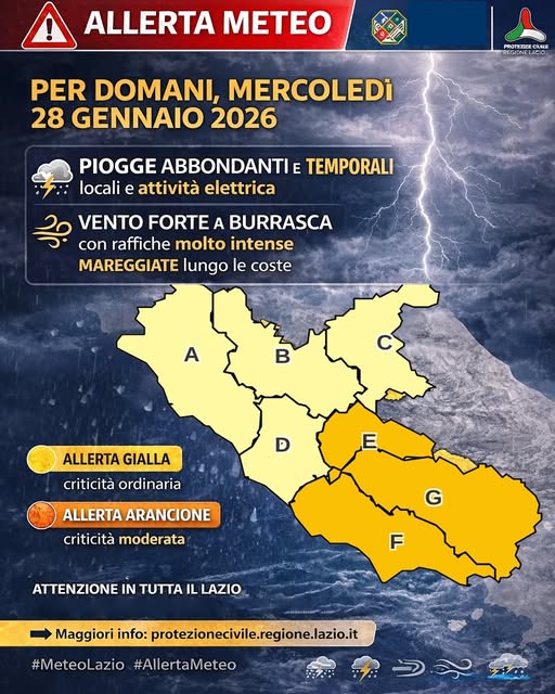 Un’ondata di maltempo intenso è attesa sul Lazio nella giornata di mercoledì 28 gennaio 2026, con piogge abbondanti, temporali e forti raffiche di vento che potrebbero causare disagi e criticità sul territorio. Le autorità regionali hanno diramato un bollettino di allerta meteo che interessa l’intera regione.