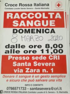 Dalle 8:00 alle 11:00 ti aspettiamo presso la sede della Croce Rossa Santa Marinella – Santa Severa, in via Zara a S.Severa. Dona il sangue salva una vita.