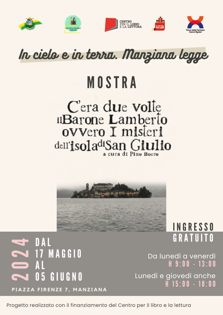 Prosegue il progetto “In cielo e in terra. Manziana legge”, finanziato dal Centro per il libro e la lettura e, dopo i laboratori, le letture e le attività di formazione, il 17 maggio aprirà al pubblico la Mostra “C’era due volte il Barone Lamberto ovvero I misteri dell’isola di San Giulio” del Parco Della Fantasia Gianni Rodari di Omegna (VB), paese natale dello scrittore, stabilendo così un rapporto tra i suoi luoghi dell’infanzia e Manziana, paese da lui scelto e amato.