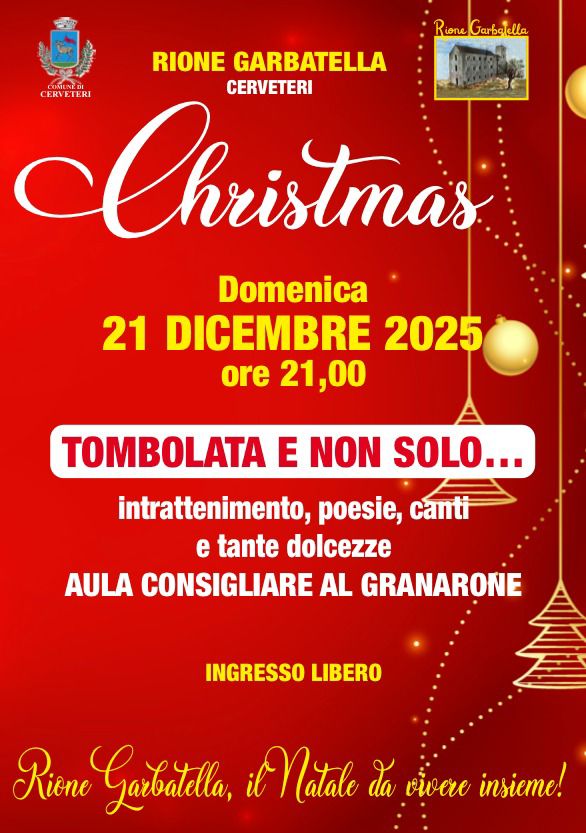 Il Natale si avvicina e il Rione Garbatella invita tutta la cittadinanza di Cerveteri a vivere insieme un momento di gioia e condivisione. Domenica 21 dicembre 2025, a partire dalle ore 21:00, la suggestiva cornice dell’Aula Consigliare al Granarone si vestirà a festa per una serata indimenticabile.