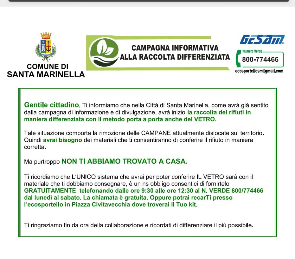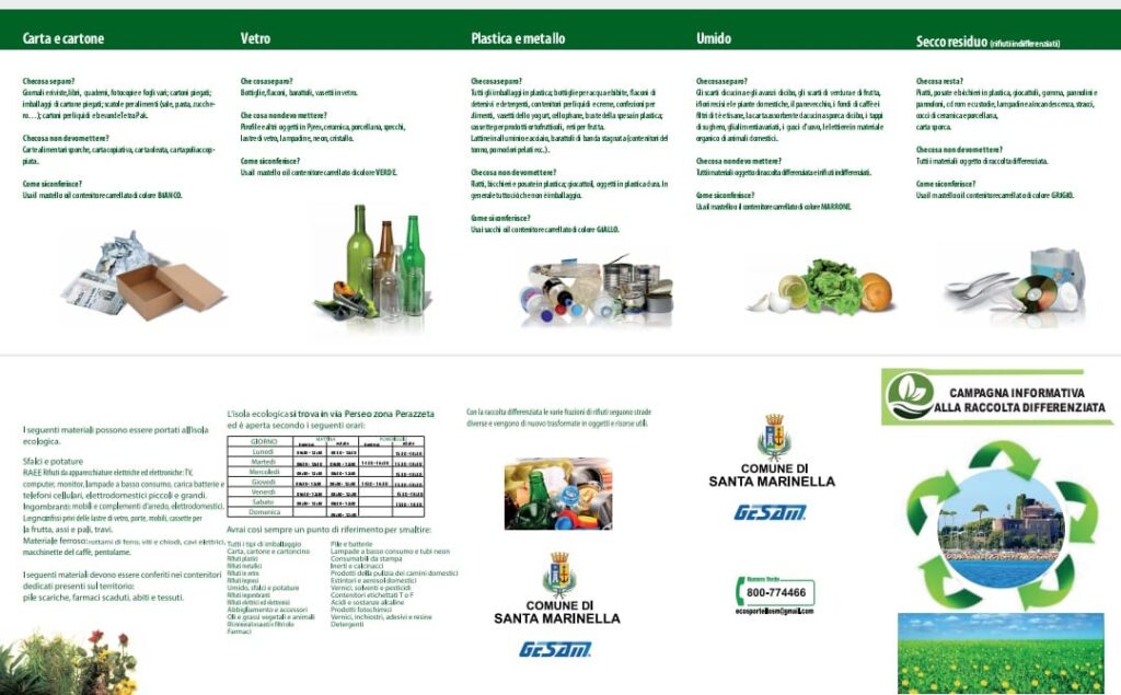 Congiuntamente alla consegna, sarà redatto apposito verbale con i dati dell’utenza. Gli opuscoli informativi saranno due, uno indicherà come effettuare un corretto conferimento della raccolta differenziata e l’altro riporterà un elenco con tutti i prodotti e gli oggetti comuni che, con indicazione esatta, potranno essere conferiti”.