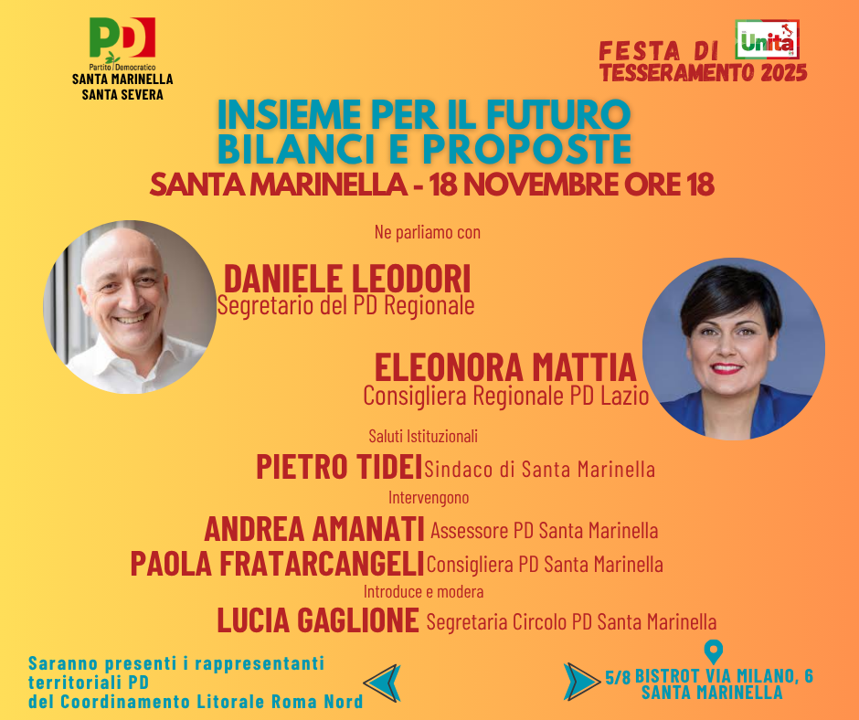 Ne parleremo con gli esponenti del PD Lazio in consiglio regionale, il segretario e consigliere Daniele Leodori, e la consigliera Eleonora Mattia. I saluti istituzionali del Sindaco Pietro Tidei. Intervengono per il PD locale, l’Assessore e Vicesindaco Andrea Amanati e la Consigliera Paola Fratarcangeli. I lavori saranno introdotti e moderati da Lucia Gaglione, Segretaria del PD di SantaMarinella.