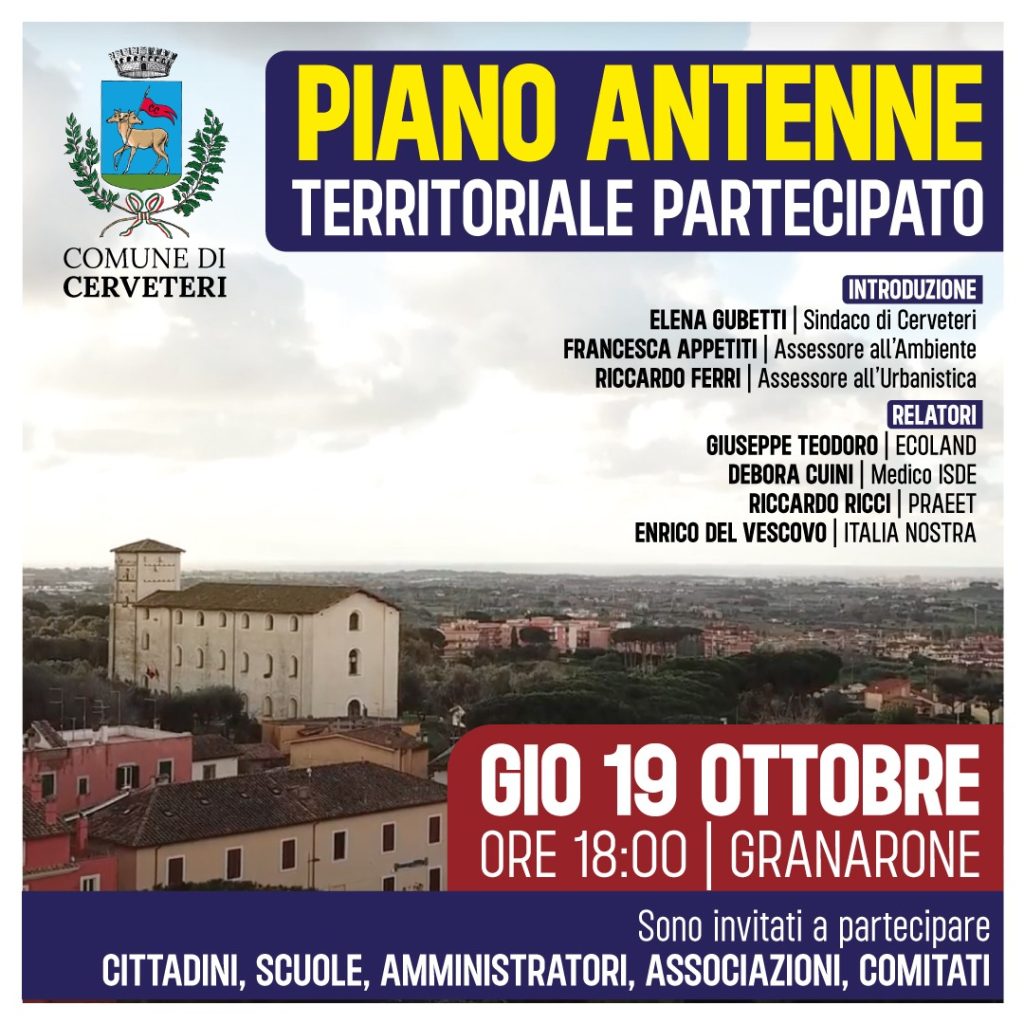 “Ridurre il rischio di esposizione alle fonti di inquinamento elettromagnetico e applicare un controllo di tutela per la salute di tutti i cittadini. Partendo da questi due principi abbiamo elaborato il piano Antenne per il nostro territorio e siamo pronti a presentarlo ai comitati e ai cittadini per avviare la fase di condivisione che porterà alla approvazione del Piano Antenne Territoriale Partecipato. Giovedì 19 ottobre, alle ore 18:00 presso l’Aula Consiliare del Granarone, alla presenza dei tecnici che hanno elaborato il piano ed esperti in materia, si terrà l’incontro pubblico al quale la cittadinanza tutta è invitata a partecipare”. Ad annunciarlo è Elena Gubetti, Sindaco di Cerveteri.