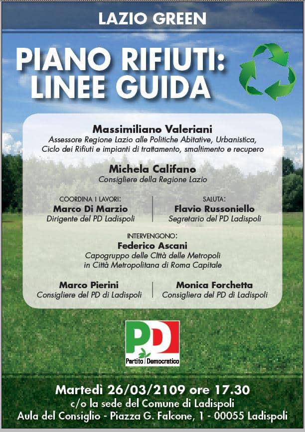 Oggi, martedì 26 marzo, ore 17.30, presso l’Aula Consiliare del Comune di Ladispoli ubicata in Piazza G. Falcone n.1, all’evento, e per relazionare sull’argomento, saranno presenti: Massimiliano Valeriani, Assessore Regionale Lazio con Delega al Ciclo dei Rifiuti e impianti di trattamento, smaltimento e recupero; Michela Califano, Consigliere Regionale Lazio; Federico Ascani Capogruppo di “Città delle Metropoli” in Città Metropolitana di Roma Capitale; Marco Pierini e Monica Forchetta, Consiglieri Comunali PD; oltre al saluto del Segretario PD Ladispoli Flavio Russoniello ed il Coordinamento della manifestazione affidato a Marco Di Marzio della segreteria PD Ladispoli.