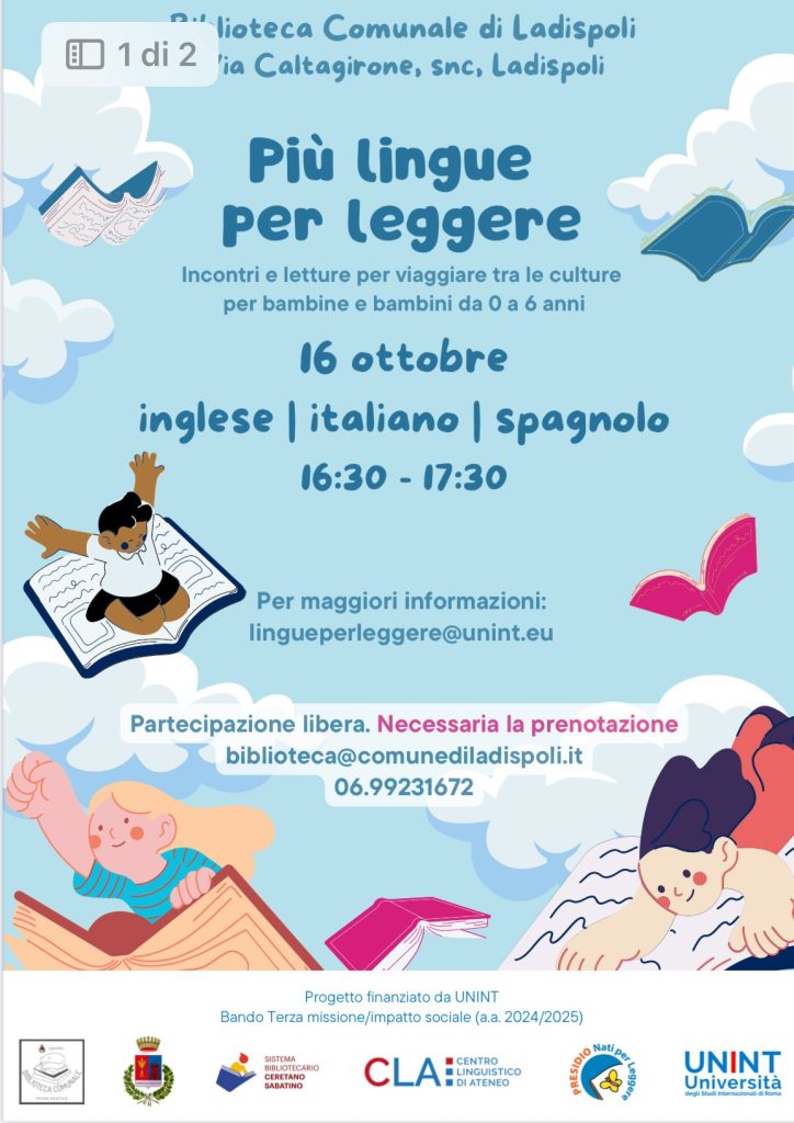 L’iniziativa, intitolata “Più lingue per leggere: incontri e letture per viaggiare tra le culture”, è rivolta ai bambini e alle bambine di età compresa tra 0 e 6 anni. L’appuntamento è fissato per giovedì 16 ottobre 2025, a partire dalle ore 16:30, nella spaziosa Sala Conferenze della Biblioteca.