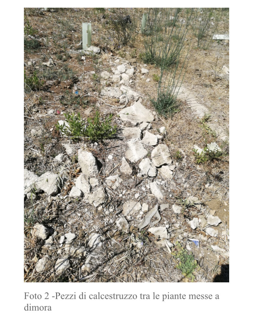 Su quasi tutta la superficie dell’area piantumata troviamo, infatti, ben evidenti pezzi di asfalto proveniente presumibilmente dal rifacimento del manto delle strade comunali, pezzi di calcestruzzo e pezzi di travertino provenienti dalla ristrutturazione di edifici abitativi; era infatti usuale smaltiremateriali di diversa origine e abbandonarli su terreni inutilizzati con evidente risparmio sulla spesa per lo smaltimento. In quell’area in particolare è stato smaltito tanto di quel materiale che alla fine l’orografia ne è stata modificata.