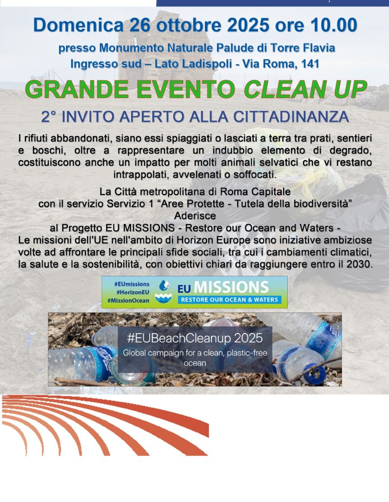 Domenica 26 ottobre 2025, alle ore 10:00, presso il monumento naturale di Torre Flavia – ingresso sud, lato Ladispoli, in Via Roma 141 – si terrà il Grande evento Clean Up, un’iniziativa dedicata alla tutela dell’ambiente e alla valorizzazione del territorio.