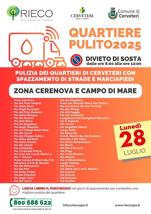 Spazzamento meccanico e manuale delle strade, rimozione di rifiuti abbandonati e successiva bonifica delle aree e pulizia di marciapiedi e cigli stradali che per cinque lunedì consecutivi vedranno impegnati a Cerenova e Campo di Mare tutto il personale operativo della Rieco S.p.A., gestore del servizio di igiene urbana. Si tratta di ‘Quartiere Pulito’, un progetto sperimentale che ha preso il via lunedì 30 giugno e proseguirà per tutti i lunedì di luglio.