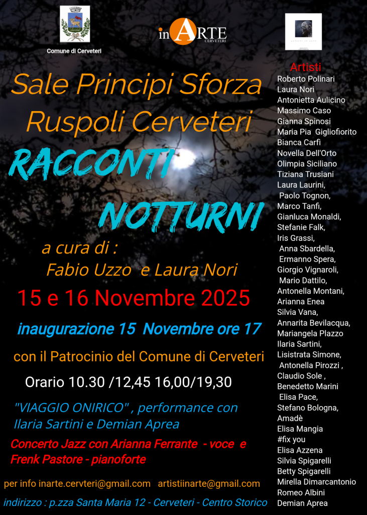Il vernissage è previsto sabato 14 novembre nelle storiche Sale Ruspoli, con il patrocinio del Comune di Cerveteri e la presenza dei presidenti delle due associazioni coinvolte, Fabio Uzzo e Laura Nori, curatori degli artisti che danno vita ai Racconti Notturni.