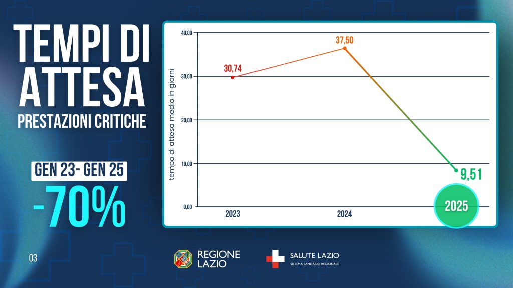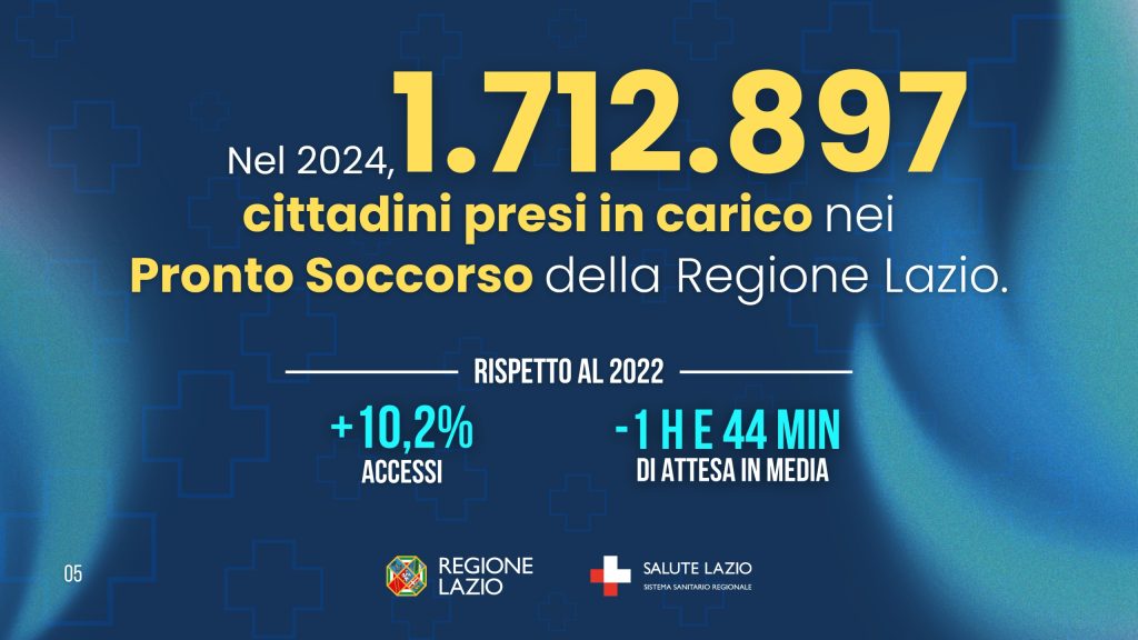 Tra il 2022 e il 2024 il tempo medio di attesa dalla visita medica alla dimissione in pronto soccorso è sceso del 12,4% (da 479,5 minuti a 419,8 minuti), pari a circa 1 ora in meno per singolo accesso. Tali riduzioni, oltre allo sforzo del personale sanitario, sono il frutto anche dei progetti sperimentali per la riduzione dei tempi di attesa nei pronto soccorso e dei posti letto acquistati con la chiusura dell’ospedale di Tivoli. Tali acquisti straordinari, nel corso del 2025 sono stati resi ordinari con la delibera di giunta regionale 1186 del 30/12/2024 “Definizione dei livelli massimi di finanziamento, dei criteri di assegnazione dei budget 2025 e delle regole di remunerazione. Modifiche allo schema di Accordo/Contratto ex art. 8 quinquies D. Lgs. n. 502/92 e s.m.i. per gli anni 2025-2026”.