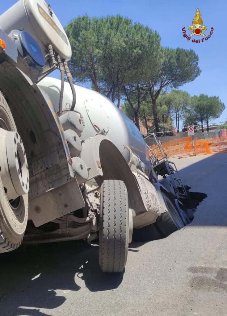 Complicate le operazioni di rimozione del mezzo pesante a cui stanno lavorando i vigili del fuoco del comando provinciale di Roma intervenuti con la squadra Tuscolano 2 e il capo turno provinciale. Betoniera del peso di oltre 10 tonnellate che verrà tolta dalla buca con l’utilizzo di due autogru.