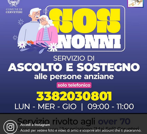 Nei giorni di lunedì, mercoledì e giovedì, nell’orario compreso tra le 9.00 e le 11.00, i volontari dell’Associazione APS Mai Soli Cerveteri sono disponibili per offrire ascolto e supporto alle persone anziane durante queste lunghe giornate estive, caratterizzate dalla presenza del sole e dalla potenziale necessità di acquisire farmaci o svolgere pratiche burocratiche inerenti agli uffici comunali.