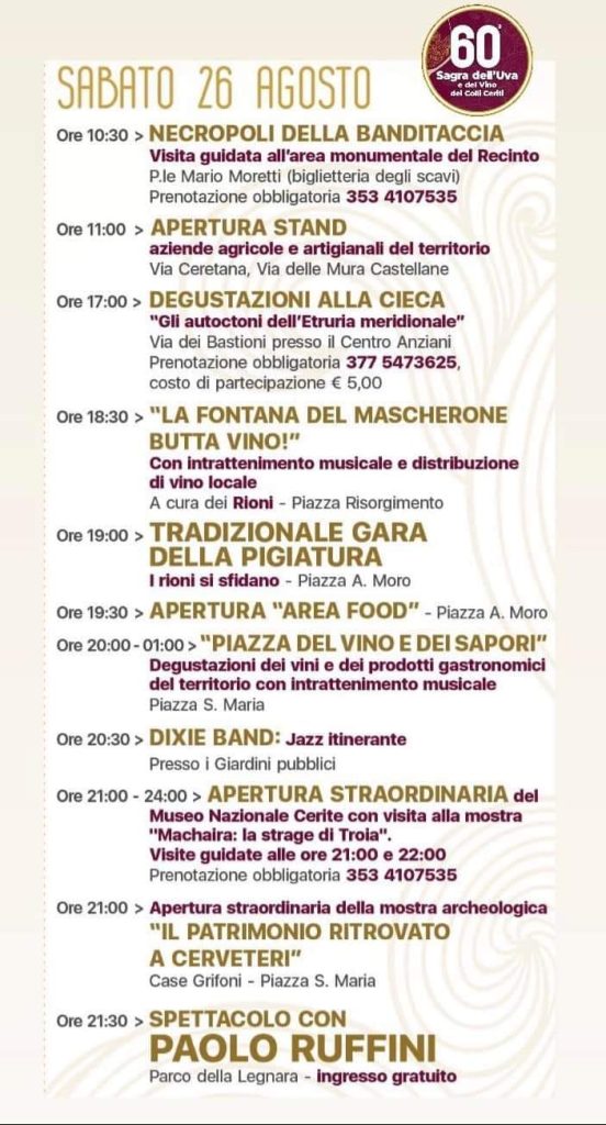 Proseguono con successo le serate della sagra dell’uva e del vino di Cerveteri. Questa sera, Sabato 26 agosto, da non perdere la celebre ” fontana del mascherone butta vino”, l’apertura della mostra archeologica “il patrrimonio ritrovato a Cerveteri” e, infine, lo spettacolo con Paolo Ruffini alle 21:30.