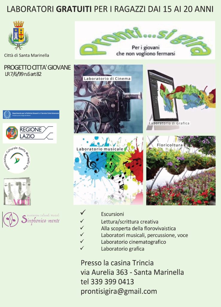 “Presentato lo scorso giovedì 1° luglio nei ritrovati spazi della Casina Rosa il Progetto: “Pronti ….Si gira” un innovativo percorso formativo e ludico destinato ai giovani tra i 15 e 20 anni, madrine dell’ iniziativa la consigliera comunale Maura Chegia e la direttrice della biblioteca comunale dottoressa Cristina Perini che hanno illustrato una iniziativa che, fattivamente sarà portata avanti da tre associazioni culturali: Le Voci, Simphonicamente e Santa Marinella Viva, che si sono aggiudicate il bando denominato Santa Marinella Città Giovane.”