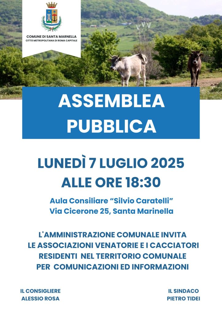 E’ stata convocata per lunedì 7 luglio alle ore 18:30 presso l’Aula consiliare “Silvio Caratelli” in via Cicerone, l’assemblea pubblica rivolta alle associazioni venatorie e ai cacciatori residenti nel Comune di Santa Marinella.