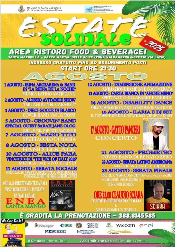 A Santa Marinella, proseguono gli appuntamenti del programma Estate Solidale 2025 al Parco Martiri delle Foibe, con eventi imperdibili dal 21 al 23 agosto.