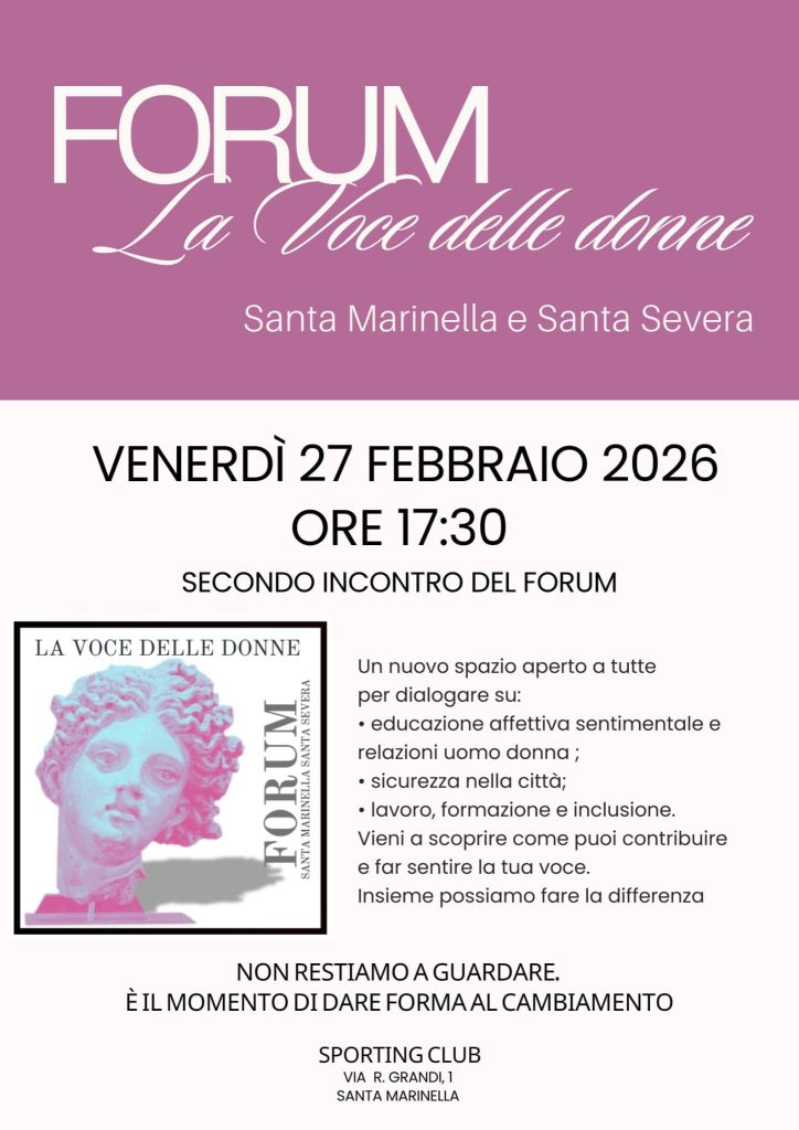 Il 27 febbraio alle ore 17.30, presso lo Sporting Club di Santa Marinella, si svolgerà il secondo incontro del Forum delle Donne di Santa Marinella e Santa Severa, un appuntamento che segna il passaggio dalla fase di ascolto a quella operativa.