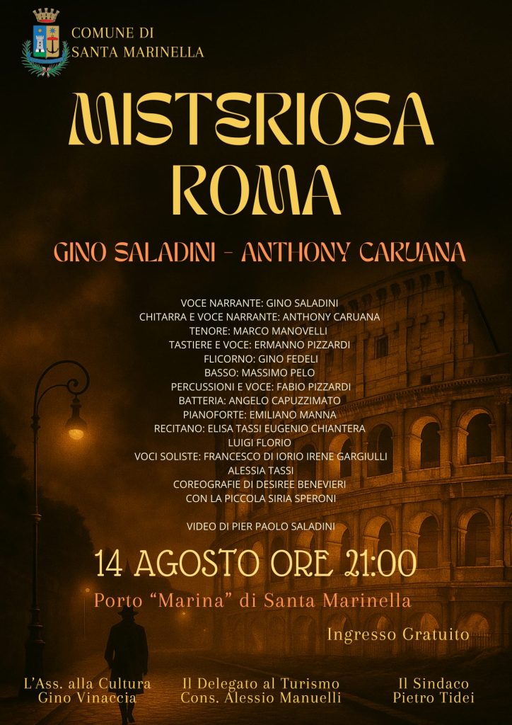“MISTERIOSA ROMA” è il titolo dello spettacolo di Gino Saladini e Anthony Caruana in scena al Porticciolo “Marina”, giovedì 14 agosto alle ore 21:00. Un omaggio divertente, profondo e coinvolgente alla Roma che non smette mai di stupire. Entrata libera.