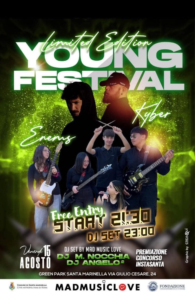 La sera del 15 agosto al Green Park in via Giulio Cesare, arriva la terza edizione del Young Fest, evento imperdibile organizzato dal Comune di Santa Marinella in collaborazione con MadMusicLove e Fondazione Cassa di Risparmio di Civitavecchia. Uno spazio dedicato interamente ai giovani con tanta musica. Si esibiranno i gruppi musicali The Enems e Kyber e a seguire DJ-SET della Mad Music Love con Matteo Nocchia e Angelo Monaldi. Entrata Libera