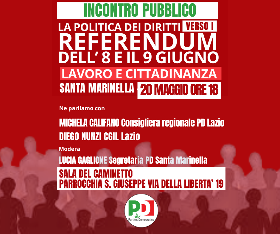 “Il Partito Democratico di Santa Marinella e Santa Severa invita tutte e tutti a partecipare, il prossimo 20 maggio ore 18, presso la “sala del camino” parrocchia San Giuseppe, Via della Libertà 19. Interverranno in qualità di relatori, Michela Califano, consigliera regionale del PD Lazio, e Diego Nunzi, rappresentante della CGIL Lazio. Modera l’incontro Lucia Gaglione, Segretaria del Circolo PD di Santa Marinella e Santa Severa.