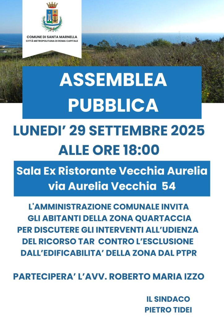 “Manca pochissimo all’incontro cruciale per il futuro della zona Quartaccia. Il Comune di Santa Marinella rinnova l’invito a tutti i residenti e i cittadini interessati a partecipare all’Assemblea Pubblica che si terrà: