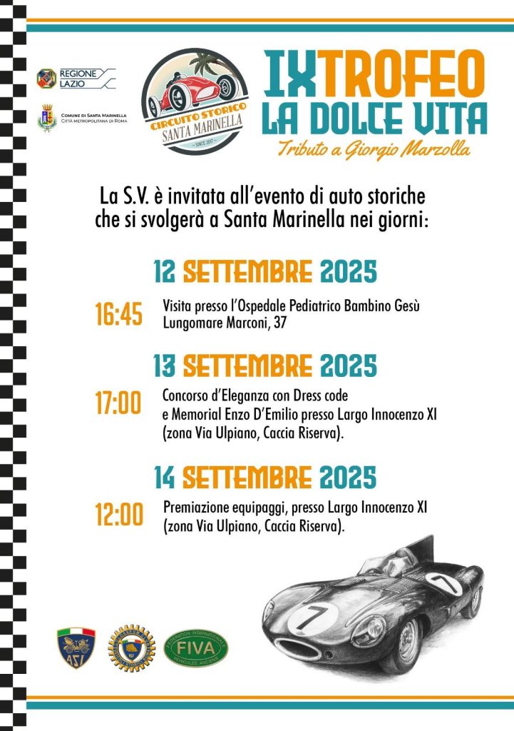 È stato presentato lunedì mattina presso l’aula consiliare “Silvio Caratelli” del Palazzo Municipale di Santa Marinella, il programma della IX edizione del Trofeo “La Dolce Vita”, che si svolgerà dal 12 al 14 settembre. Presenti il sindaco Pietro Tidei, l’assessore alla cultura Gino Vinaccia, il presidente del Circuito Storico Daniele Padelletti e i soci Silvia Serino, Roberto Magni, Umbro Passone e Salvatore Crocioli.