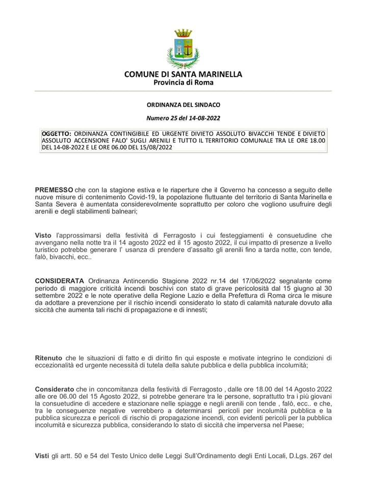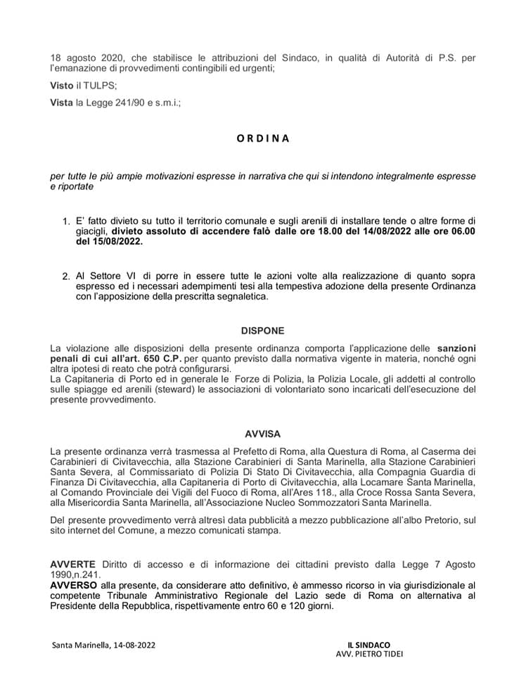 Il comune di Santa Marinella ha emesso una ordinanza di divieto assoluto di bivacchi tende e accensione falò sugli arenili.