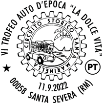 In occasione del VI Trofeo di Auto d’Epoca in programma a Santa Severa (Rm) domenica 10 settembre, Poste Italiane attiverà un Servizio Filatelico Temporaneo con bollo speciale con la dicitura “VI TROFEO AUTO D’EPOCA “LA DOLCE VITA” richiesto dal Circuito Storico Santa Marinella.