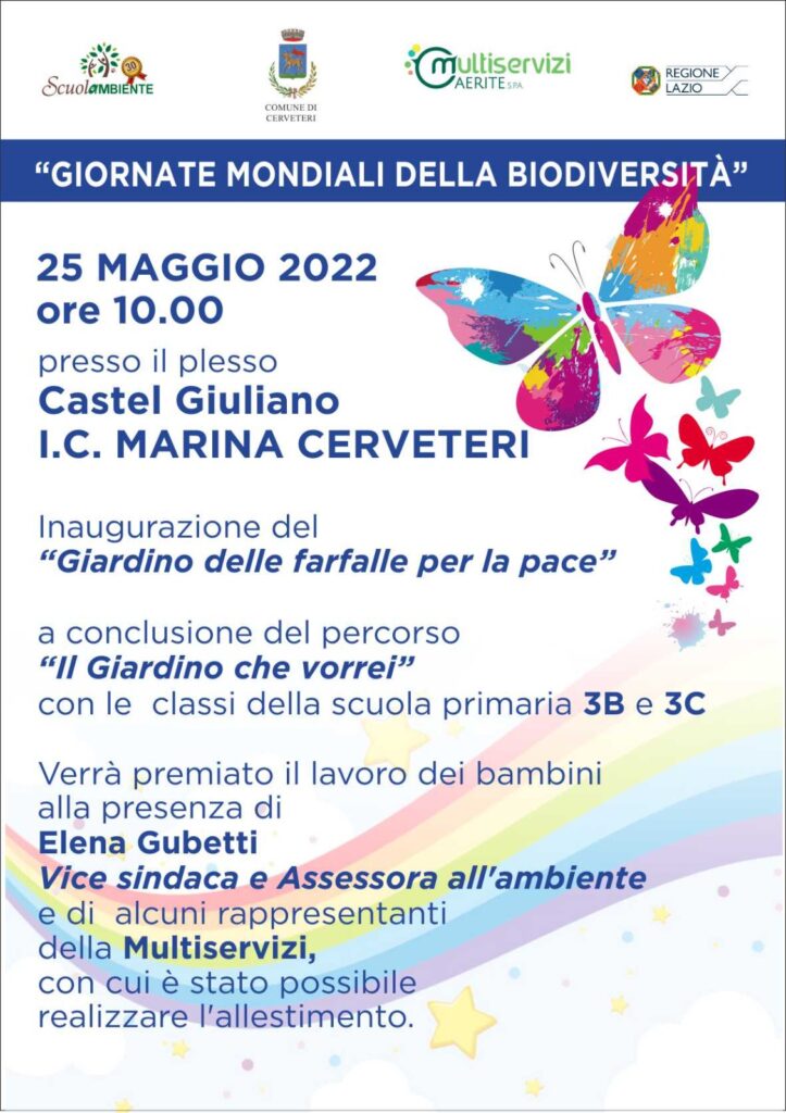 Il 25 maggio si inaugurerà presso l’I.C. Marina di Cerveteri il “Giardino delle Farfalle per la Pace”, allestito grazie al lavoro delle insegnanti e dei bambini che lo hanno arricchito dei loro manufatti e grazie alla collaborazione degli operatori della Multiservizi che hanno aiutato a mettere a dimora bellissime piante attrattive per farfalle e altri insetti.