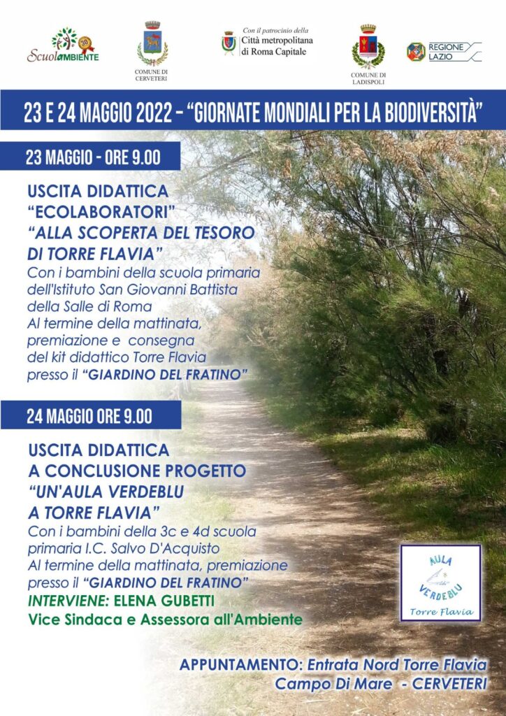 Il 23 maggio si svolgerà al Monumento Naturale Palude di Torre Flavia un’uscita didattica “Alla scoperta del Tesoro di Torre Flavia” con gli alunni della Scuola primaria San Giovanni Battista della Salle di Roma e il 24 maggio, sempre a Torre Flavia si concluderà il percorso “Un’Aula Verdeblu” svolto con le classi 3C e 4D primaria dell’I.C. Salvo D’Acquisto di Cerveteri.