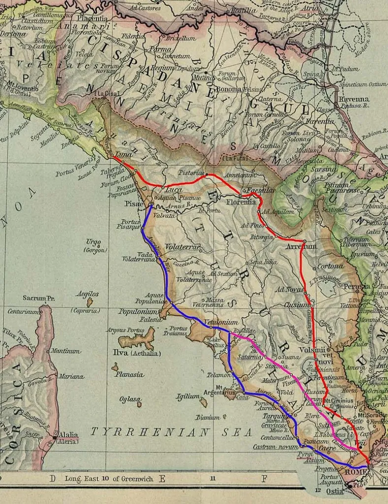 La prima tratta che fu costruita della Via Aurelia ebbe il suo inizio dal Foro Boario di Roma e passando attraverso la zona paludosa che era in Trastevere ( Trans Tiberim – oltre il Tevere – ndr) sul viadotto, in parte, ancora visibile, nelle cantine di via della Lungaretta ( chi scrive lo ha visitato), e terminava a Cerveteri (Caere in antico romano, Caisra in etrusco, Agylla in greco) e fu costruita nel 241 a.C. da un magistrato della gens Aurelia (nomen est omen – Plauto – ndr) il censore Gaio Aurelio Cotta e collegava la Aeterna Urbs ( vds Tibullo – ndr) con Caere (vedesi sopra) ove terminava. Non fu casuale che, l’Etruria, Roma l’aveva appena sottomessa. L’antica Via Aurelia costeggiava il Mar Tirreno e poi il Mar Ligure per entrare poi in Gallia (Francia) per proseguire il suo “cammino” giungendo fino ad Arles in Francia per poi confluire, ad Ernaginum, (attuale Saint Gabriel) nella Via Domizia fino a giungere in Spagna (Tarragona docet). La prima tratta che fu costruita della Via Aurelia quella appunto che portava all’attuale Cerveteri nella parte terminale non ricalcava l’attuale Via Aurelia ma bensì il suo tracciato era quello che, attualmente, si identifica con la strada che transita accanto all’ attuale“Castellaccio” dei Monteroni (nella zona furono rinvenute pure alcune tombe a tumulo etrusche; Etruschi che, fra l’altro, si citavano come il popolo dei Rasenna oppure dei Rasna – ndr) ma che poi girava a destra verso Cerveteri mentre, attualmente, dopo il rettilineo, la suddetta strada gira a sinistra per ricongiungersi con la moderna Via Aurelia. Su alcune delle antiche vie, consolari e non, dell’antica Roma sulle loro origini e sulla loro storia, fra l’altro molto legata all’antica historia, ci sarebbe molto da dire soprattutto da parte dello scrivente che, come storico, ha studiato per molti anni tutto ciò, ma sopratutto per motivi di spazio e per non tediare? il lettore mi limiterò all’essenziale: Quali sono le strade più antiche e dove recavano sia in ambito civile che militare (non dimentichiamoci che l’Impero Romano se ne servì, abbondantemente, per farvi marciare anche le sue “quadrate” legioni ed anzi, alcune di esse, furono costruite proprio nella sua fase espansiva). A sud si dipartiva la importante e famosa Via Appia che è la più antica via romana e fu iniziata nel 312 a.C. quando fu console Appio Claudio. La Via Appia ( il “ponte verso l’Oriente”) recava ai porti di Taranto e Brindisi in Puglia ed attraversava la Campania. Chi scrive ha percorso, varie volte, i suoi primi quindici chilometri ( da Roma a Marino – Frattocchie) riportandone una impressione indimenticabile per la bellezza che globalmente esprime. Attualmente tale Via è candidata a divenire Sito UNESCO. Al centro dell’Italia c’è la Via Cassia che nacque come antica strada consolare romana e collegava Roma con l’Etruria. Fu costruita a partire dal III o dal II secolo a.C., ed inizialmente finiva a Chiusi, per essere poi fu prolungata fino a Fiesole per proseguire, successivamente, verso la costa tirrenica, con più percorsi, e giungeva fino a Luni, dove iniziava la via Aemilia Scauri. Nel corso dei secoli la Via Cassia, proprio per la sua centralità, ha avuto molte varianti fra cui vanno notate, in particolare, quelle appenniniche recanti verso la Gallia Cisalpina Nel medioevo le sue prime sessantaquattro miglia recanti fino a Bolsena coincisero con un tratto della via Francigena. E poi è da segnalare, soprattutto per la sua importante valenza militare e commerciale, la Via Clodia detta anche la “Via delle Terme” in quanto attraversava, nel suo tragitto, varie antiche e famose terme tra cui quelle di Vicarello, Stigliano e Saturnia. La via Clodia era di corto raggio e serviva per collegare la via Cassia con la via Aurelia. Il suo nome derivò da quello di un ignoto magistrato della Gens Claudia che la fece costruire. Come altre vie antico romane anche la Clodia seguiva un tracciato già esistente al tempo dei Rasenna (gli Etruschi) che fra Pitigliano, Sorano e Sovana prendeva anche il nome di Via delle Cave. Ovviamente anche la Via Clodia, che risulta già fosse pavimentata nel 225 a.C. con i famosi basoli antico romani, servì all’ esercito dell’Urbe quando penetrò e poi conquistò la Tuscia (l’Etruria). Insomma la storia è storia e, come suddetto, tutte le Vie, consolari e non, dell’Antica Roma furono calcate molto dai soldati romani nella prima, seconda e terza fase espansiva che portò l’Impero Romano a giungere ed istituire i suoi Valli addirittura fino ai remoti, all’epoca, confini della Caledonia (così gli antico romani nomavano la Scozia).