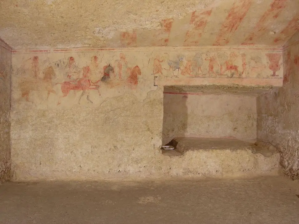 All’interno della tomba si conserva un ciclo pittorico di grande interesse. Tra le scene ancora leggibili spicca un banchetto con tre klinai, sui quali sono distesi i convitati. Accanto al banchetto compaiono anche dei personaggi a cavallo. Collegati a rituali e simboli legati allo status sociale e al mondo dell’aldilà.