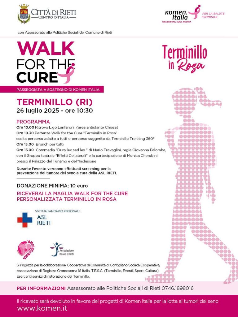 Un grande evento di solidarietà e sport si prepara a colorare il Monte Terminillo di rosa! Sabato 26 luglio 2025 si terrà la prima edizione di “Walk for the Cure – Terminillo in Rosa”, un’iniziativa in favore dei progetti di Komen Italia per la salute femminile, organizzata dalle politiche sociali del Comune di Rieti e sostenuta dall’Associazione Amiche in Rosa, con l’obiettivo di sensibilizzare l’opinione pubblica sull’importanza della prevenzione dei tumori del seno.