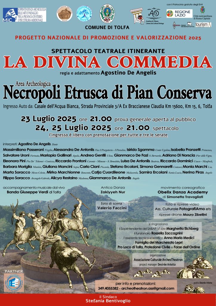 Il magnifico scenario della Necropoli di Pian Conserva, sito lungo la strada Provinciale 3/A ex Braccianese Claudia, dal 23 al 25 Luglio alle ore 21.00, accoglierà e sarà palcoscenico d’eccezione per lo spettacolo teatrale itinerante La Divina Commedia, ideato e diretto dal regista Agostino De Angelis, promosso dal Comune di Tolfa, inserito tra gli appuntamenti di spicco dell’Estate, con approvazione della Soprintendenza Archeologia Belle Arti e Paesaggio per la Provincia di Viterbo e l’Etruria Meridionale nelle persone del Soprintendente Margherita Eichberg e del Funzionario Rossella Zaccagnini, con la disponibilità della famiglia del Marchesato Lepri e organizzato dall’Associazione Culturale ArcheoTheatron e dal project manager Desirée Arlotta.