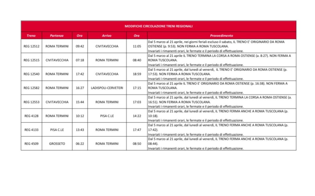 Con i lavori di potenziamento infrastrutturale della linea Roma- Civitavecchia- Pisa i treni subiranno delle modifiche, di seguito pubblichiamo le variazioni comunicate da Trenitalia