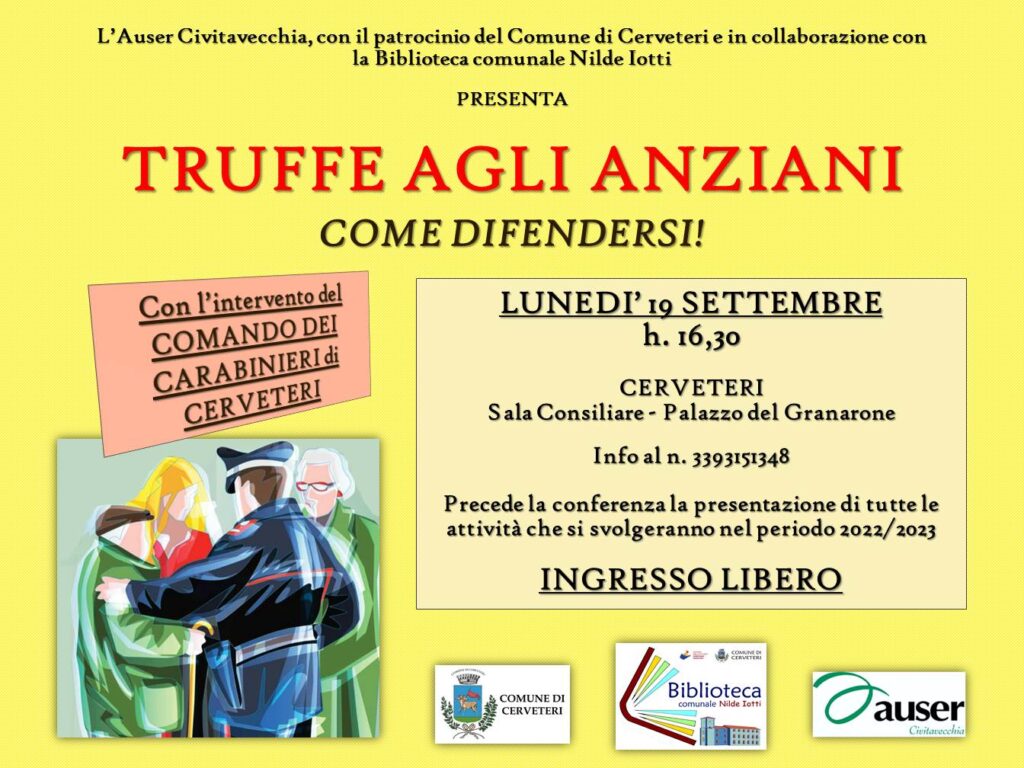 Lunedì 19 settembre alle ore 16.30 nell’ aula consiliare del Granarone il luogotenente CS Giuseppe Castellitto, comandante dei CC di Cerveteri, illustrerà i metodi delle truffe (telematiche, telefoniche oltre che dirette) ed il modus operandi dei truffatori e darà consigli sui comportamenti da seguire nel malaugurato caso di truffa.
