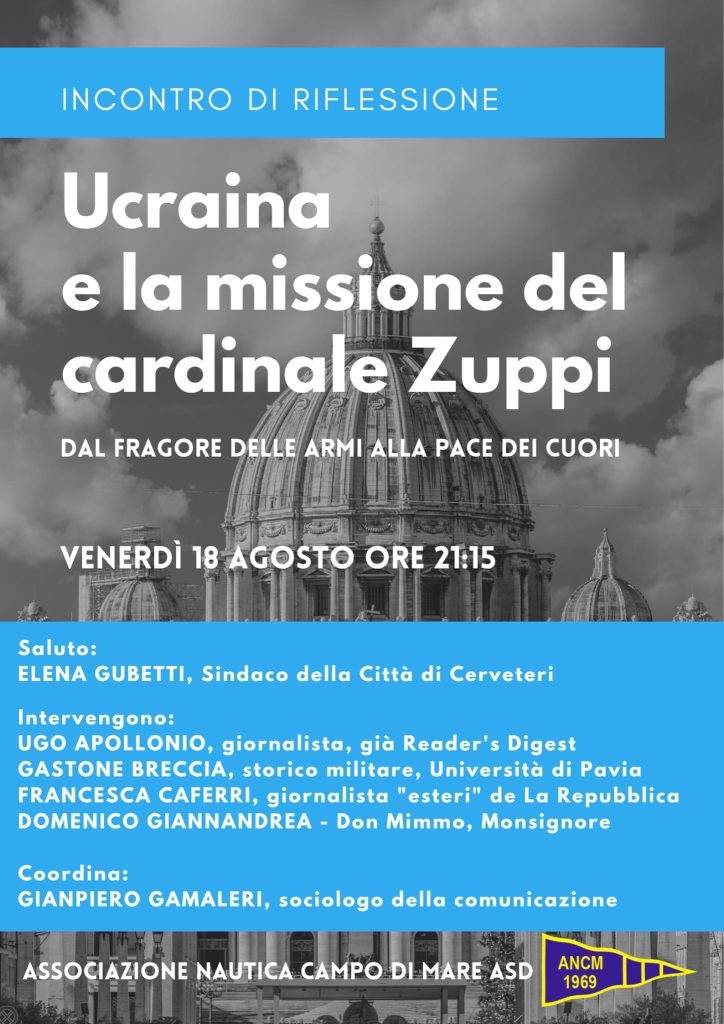 Domani sera, ore 21,15: un evento su un argomento importante e di attualità. All’Associazione Nautica di Campo di Mare si parlerà della guerra in Ucraina e della missione del Cardinale Zuppi. L’incontro ha per sottotitolo: “Dal fragore delle armi alla pace dei cuori”.