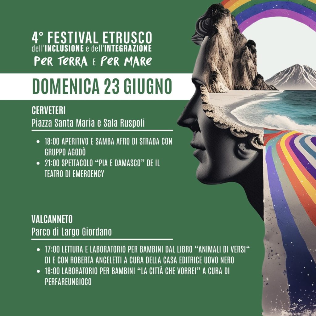Oggi, domenica 23 giugno, si svolgerà l’ultima giornata di Festival Etrusco dell’Inclusione e dell’Integrazione, la rassegna di teatro, musica, lettura e gastronomia multiculturale. L’ingresso sarà gratutito