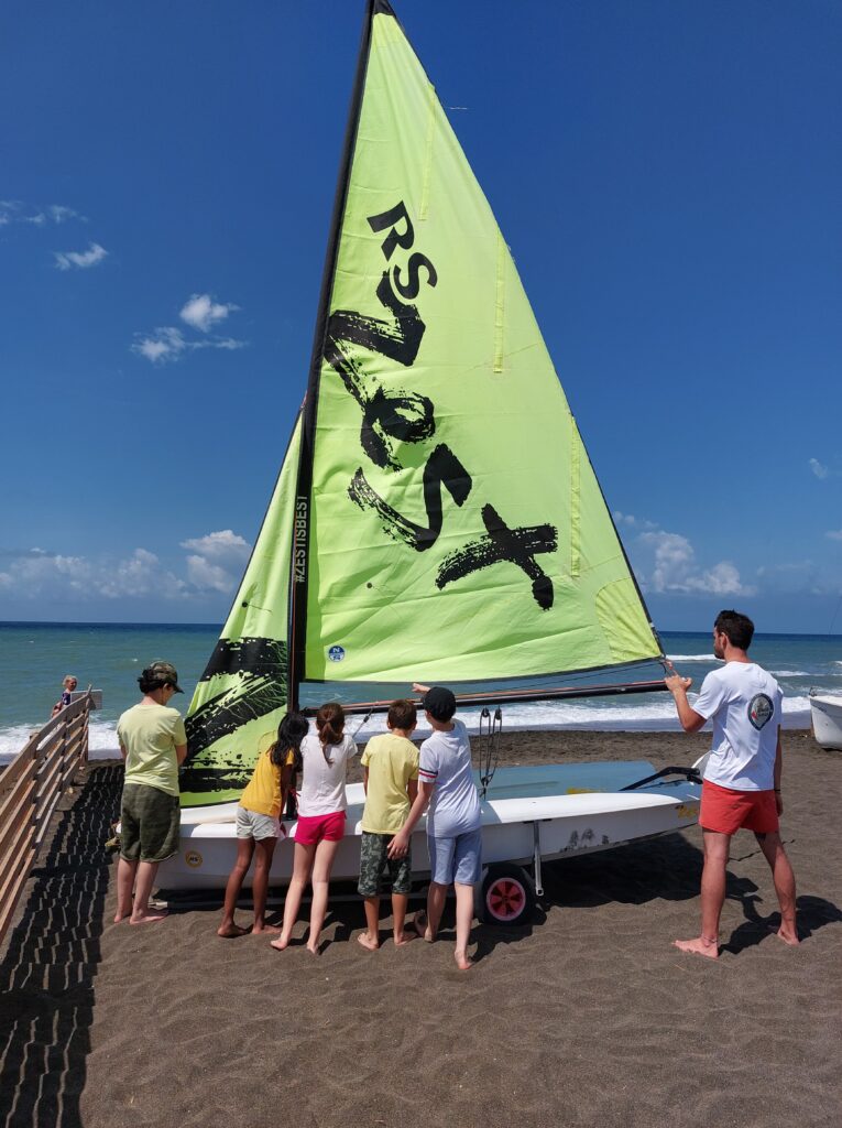 Purtroppo le condizioni del mare non hanno permesso le uscite in barca, sostituite da attività a terra con manovre sulle vele, sulle scotte e sui nodi.