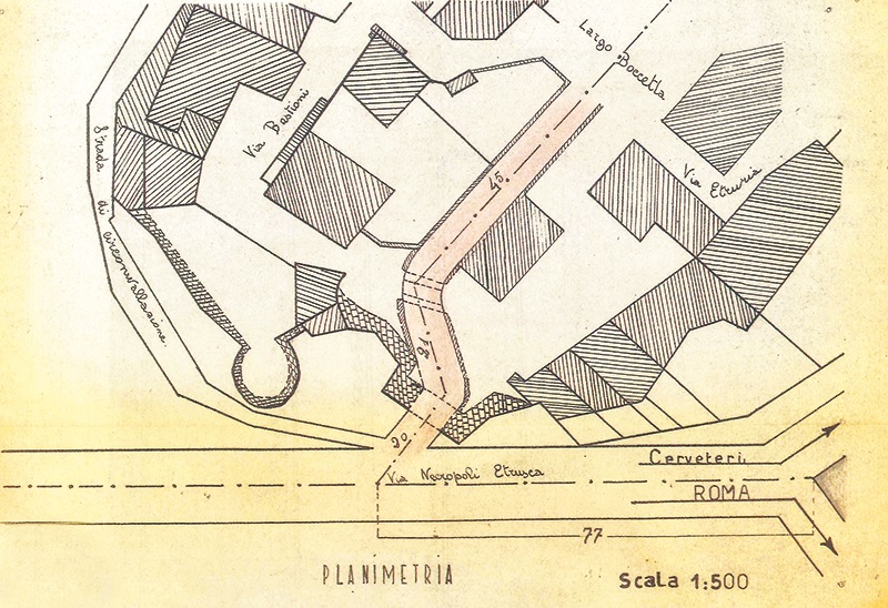 In data 25 agosto 1933-anno XI^ dell’era che fu, il geometra braccianese Giovanni S., presentò una relazione con relativo progetto e computo per l’apertura di un strada di accesso all’abitato dal lato sud. L’esigenza di tale opera viene esplicitata nella relazione del tecnico sabatino come segue: “Il vecchio abitato del Comune di Cerveteri, per la sua particolare giacitura in rilievo su tre lati, non ha che una unica via di accesso, e cioè nel lato nord, in corrispondenza della Piazza del Risorgimento. Questo stato di cose, che nel passato era pressoché inavvertito, colle mutate condizioni del traffico, reca particolare disagio agli abitanti della parte sud del paese, i quali, per discendere nella sottostante campagna, debbono percorrere l’abitato due volte (su e giù) in tutta la sua lunghezza: donde la necessità, generalmente sentita, di avere su questo lato una via di sbocco verso l’esterno del paese. Il tracciato stradale ipotizzato, avrebbe un lunghezza di m. 84, costituiti da un rettilineo incassato nel muro, raccordato, a mezzo di una curva in rilevato, con altro breve rettilineo che termina sulla strada della Necropoli Etrusca. Dovendosi superare un dislivello di m. 14 la strada avrà una pendenza del 16%, e dovrebbe partire dal fabbricato della Società Volsinia di Elettricità (nota oggi come “cabbina” ma allora era la metà in altezza )e dal muro delle proprietà Marini e Piscini. Per rendere più agevole il transito dei veicoli a trazione animale ed ai pedoni è stato divisato di fare una gettata di calcestruzzo di cm. 20 con pietrisco di cava”. Nel computo metrico estimativo della spesa, allegato alla relazione, il costo era di 22. 300 lire. La spesa si conterrà pressoché nei limiti previsti, essendo la natura del sottosuolo che si attraversa costituito da banco ininterrotto di tufo, potendosi utilizzare il pietrame ricavato per i lavori di costruzione del muro. Salvo imprevisti!